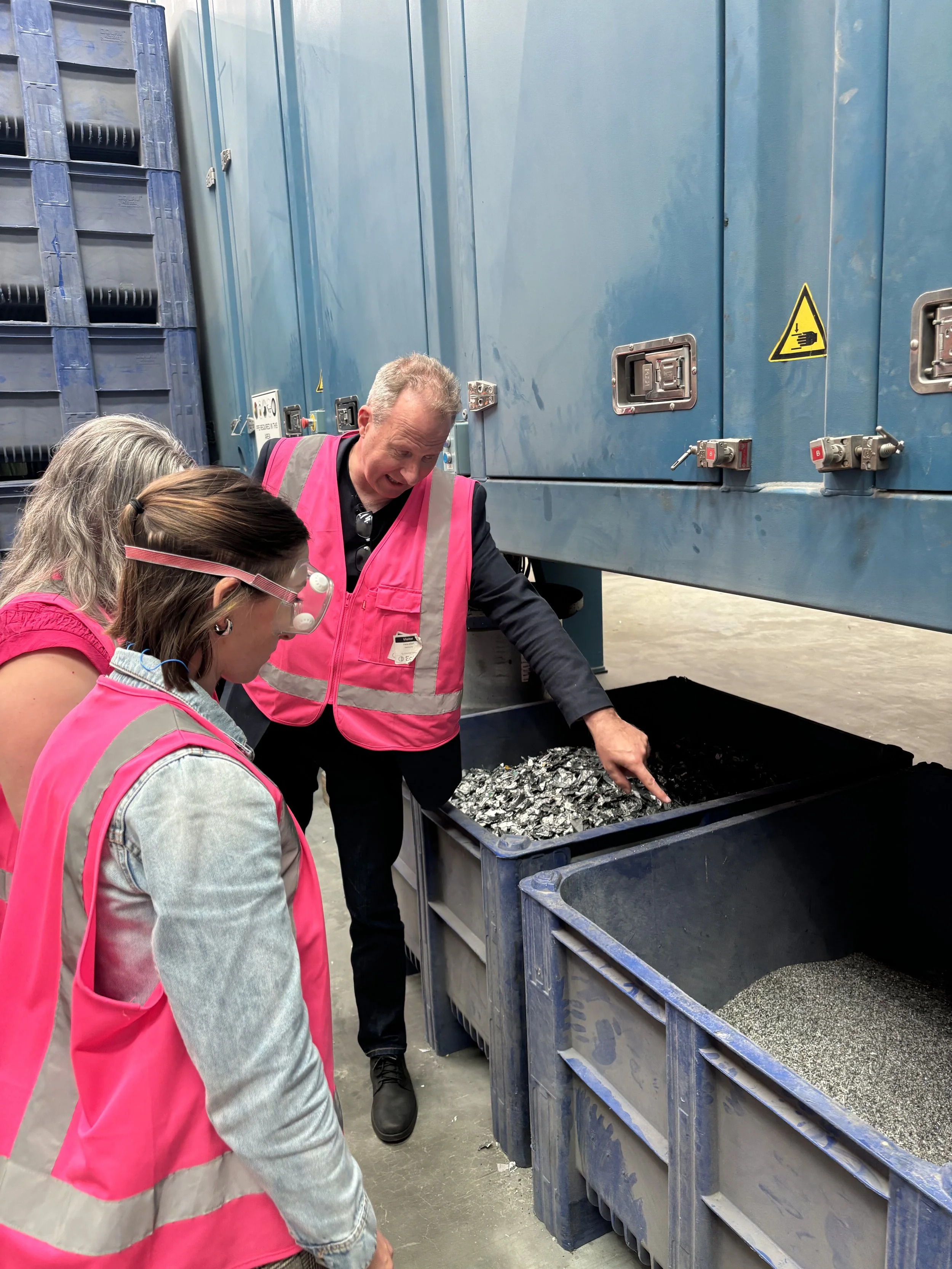 Robert from Echo shows Bronwyn and Kelsey the separation of materials as part of the e-waste process