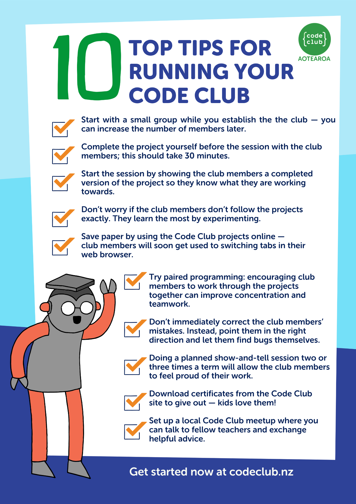 Code Club Aotearoa provides support with volunteer matching and police vetting, onboarding and parent relationship guidance, and help navigating the project guides. There's also a community of club hosts across the motu who have been exactly where new hosts are now.