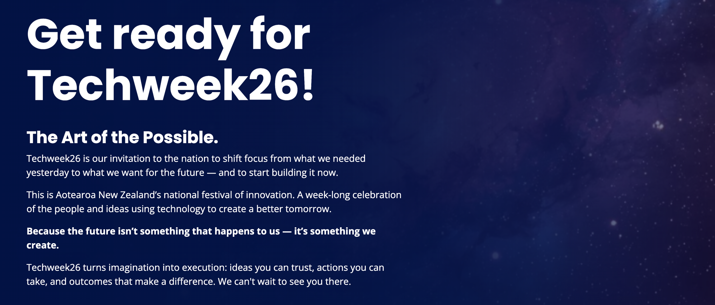 Techweek usually runs in May (18th - 24th in 2026) and showcases the best of innovation, entrepreneurship and creativity across Aotearoa.