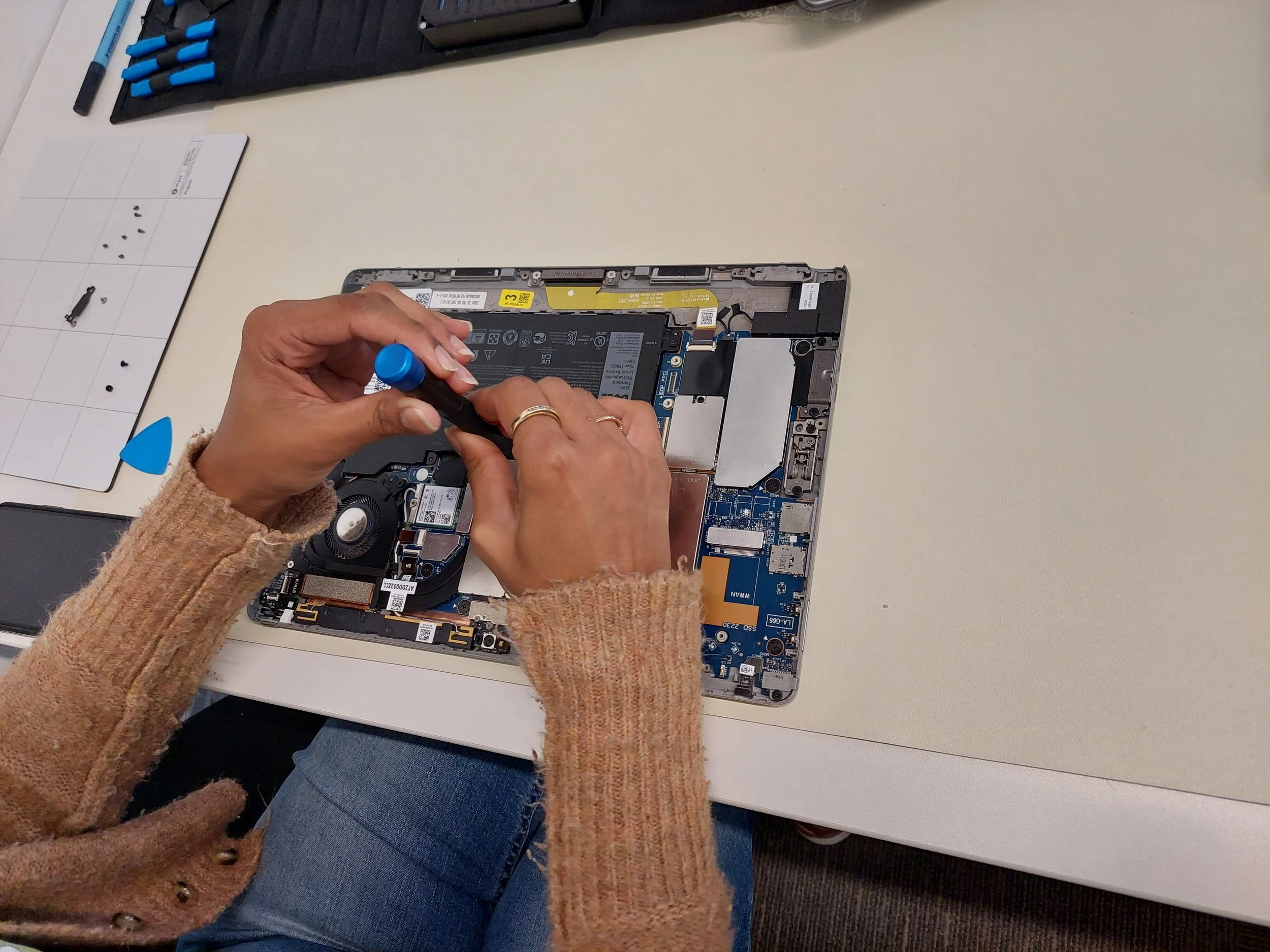 A TechMate volunteer refurbishes a RAD device ready for community donation.